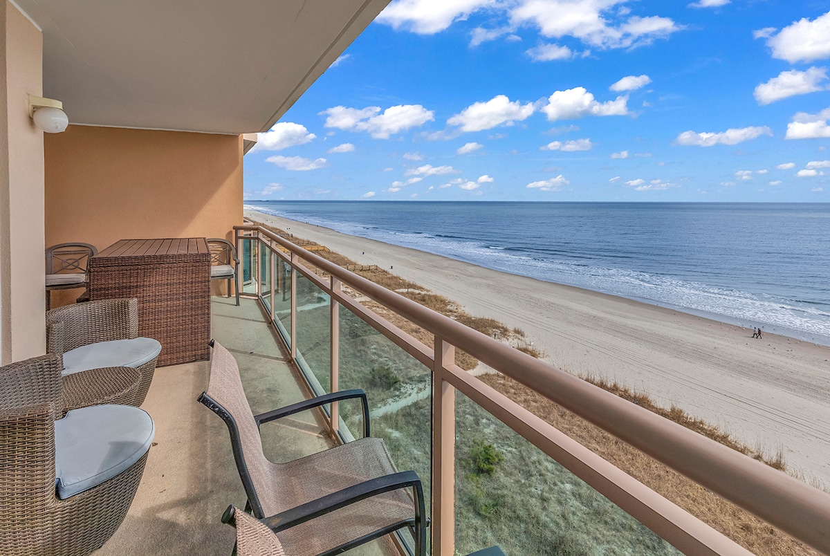 I am a proud to be a **SUPERHOST!** - Airbnb's TOP HOST Rating! This is a penthouse (11th floor) oceanfront end corner-unit located in The Oceans condo building with amazing panoramic views! There are 2 elevators in the building and an oceanfront pool with the most amazing view on the 4th floor. Location is stellar: close to grocery, restaurants, bars, mini golf, etc. Beach is wide and gorgeous here! This condo can sleep up to 9 people (8 adults and 1 baby). Fresh towels & linens included.