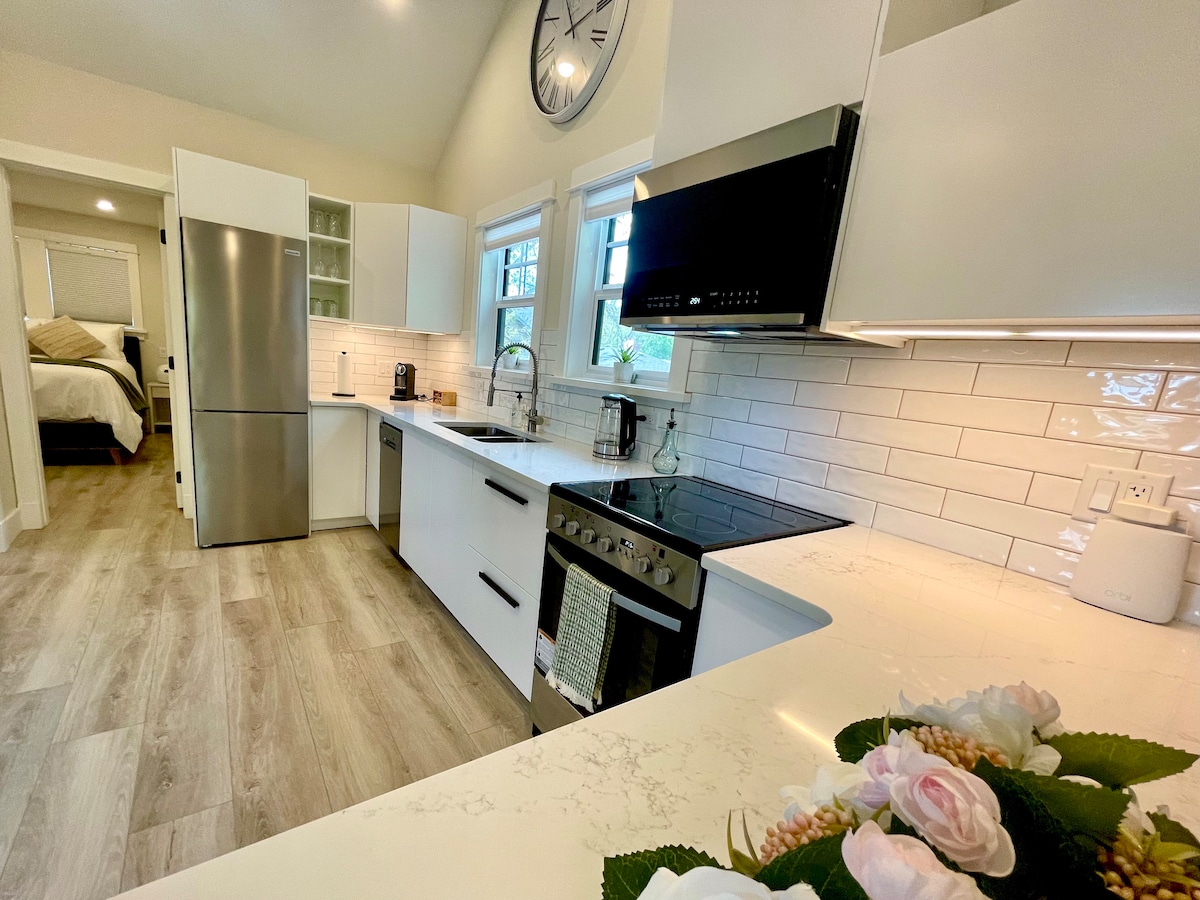 Clean. Quiet. Private. Watch the sunrise over the mountains each morning from the large deck of this brand new carriage house. A full kitchen with large island for convenient meal prep. Cozy living space with fireplace, blankets and smart TV when it comes time to chillax. Fabulous glass shower. Comfortable queen bed plus a pull out sofa. Walk to playgrounds. Safe and central rural location. Plenty of street parking. Garage parking available for smaller vehicles. (Access from inside).