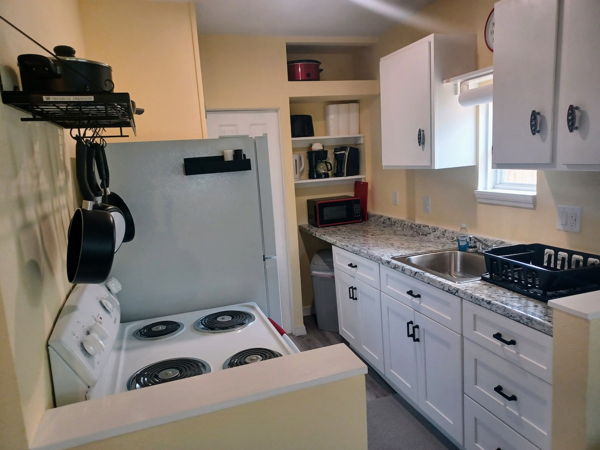 It's all about the beach! Situated on Gulf Blvd, directly across from the 123rd Street Sunshine Beach access in Treasure Island. Walk to John's Pass for restaurants, shopping, bars and music, boat trips and fishing. Ground floor, two bedroom, one bath private apartment, with all the amenities you need for a great beach vacation: beach chairs, umbrella, barbecue, bicycles. Master bedroom has a queen bed and Roku tv. Smaller bedroom has a twin bed. Full kitchen. Off street parking for one car.