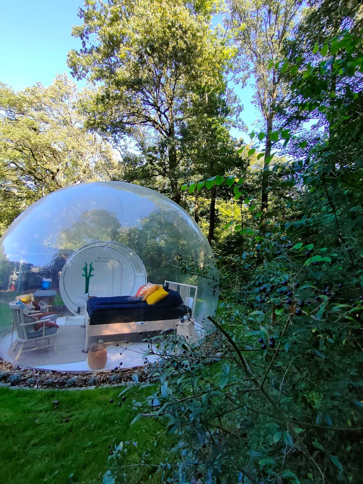 Watch the starry sky from bed, cook directly by the forest, a day at the lake and garden chickens as neighbors. The Bubbletent is located on a private property. On site you will find a comfortable bed, a very well-equipped outdoor kitchen, as well as an organic humus toilet, a solar shower and a terrace with seating and lounging options. Whether it's a romantic night with a favorite person or an adventure in nature with your family, it's possible here!