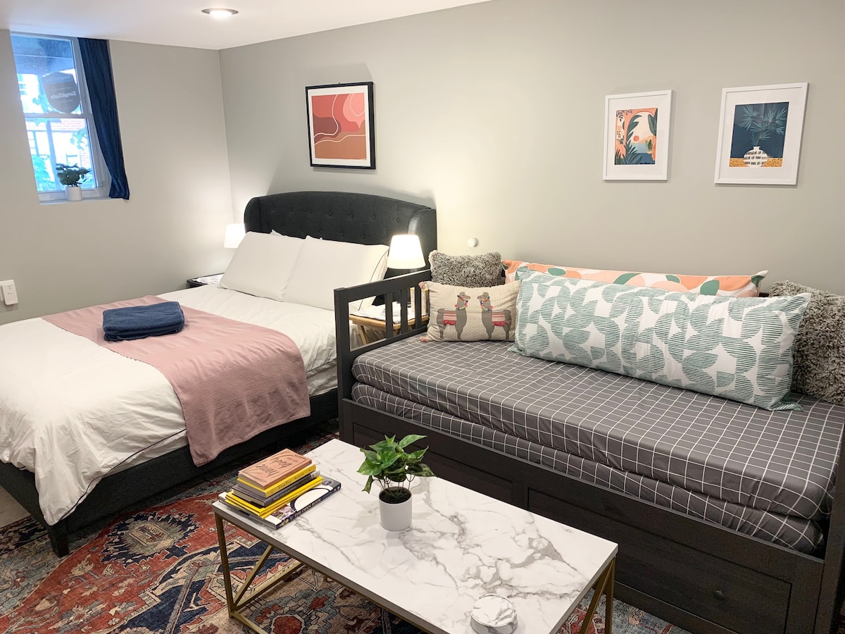 This apartment with its own private entrance sits below our brick Cape Cod-style home. The unit is totally refurbished with luxury amenities. It's a cozy bohemian cottage vibe with a touch of Miyazaki anime magic. Open floorplan includes a fully stocked kitchen with dishwasher (and new Nespresso!) plus a separate sleeping room with comfy king-sized bed and a private bathroom with a large walk-in shower. Off-street parking, fast internet, & sofa bed for extra guests. No smoking inside, please.