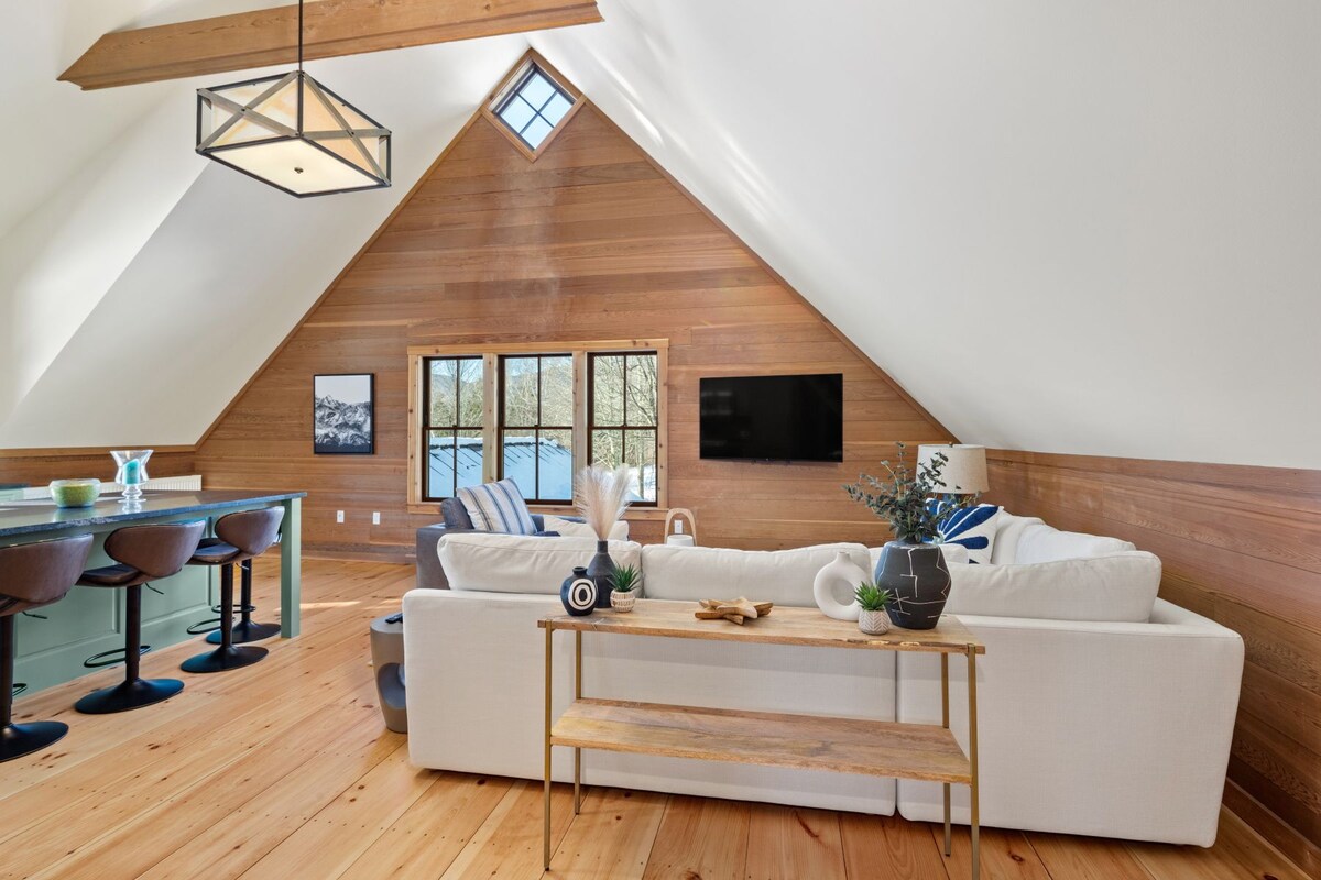 Welcome to "The Loft". A lofted space on the top floor of a timber framed barn. The owners are designer/builders who have combined the elements of old world craftsmanship with high tech efficiency to create a living space that is bright, airy and yet cozy. Powered by solar, this attached carriage barn is located on a quiet back road 3.5 miles from Woodstock Village and 3 miles from GMHA. The Loft has its own private entrance, parking and a sunset balcony. For more go to @theloft.vt