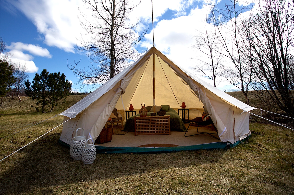 This land, Loftsstaðir-Vestri, has been in my family for generations. It used to be a farm until recently. Now we have decided to open a picturesque luxury tent hotel. We will have 10-20 tents over the summer on the field where we used to harvest hay. Each tent is furnished and decorated differently. There are nothing but farms around, there is a 5 min walk to a black sand beach where the bird life is amazing. This is the perfect place to experience real Icelandic nature in a unique manner.