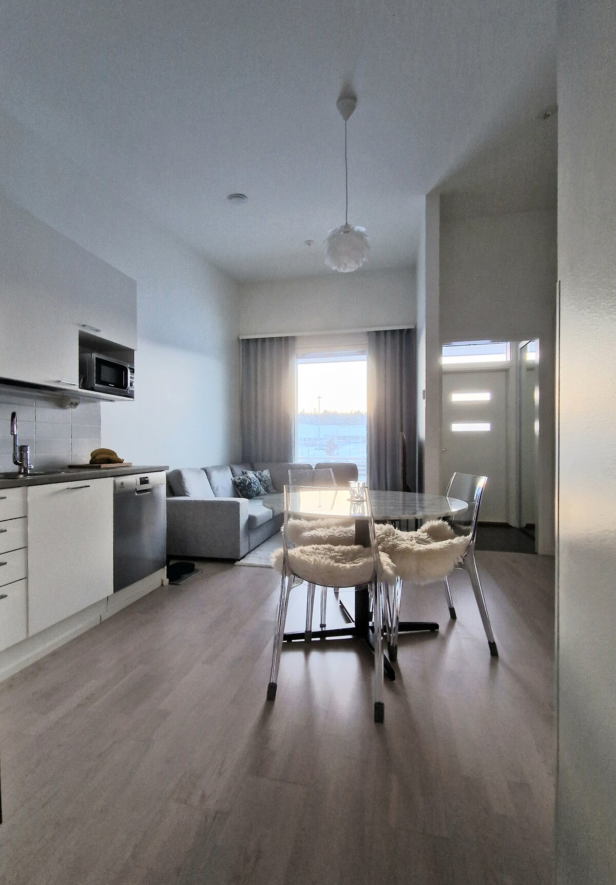 Welcome to a cozy and modern two-room townhouse in the peaceful Pöykkölä district of Rovaniemi. This stylish residence, completed in 2019, offers comfortable accommodation and perfect for tourists seeking a retreat from the hustle and bustle of the city amidst scenic forests. Unwind in your private sauna after a day of activities. A well-equipped kitchen and comfortable living spaces make your stay perfect. Book now and experience the enchanting beauty of Lapland in the heart of Pöykkölä.