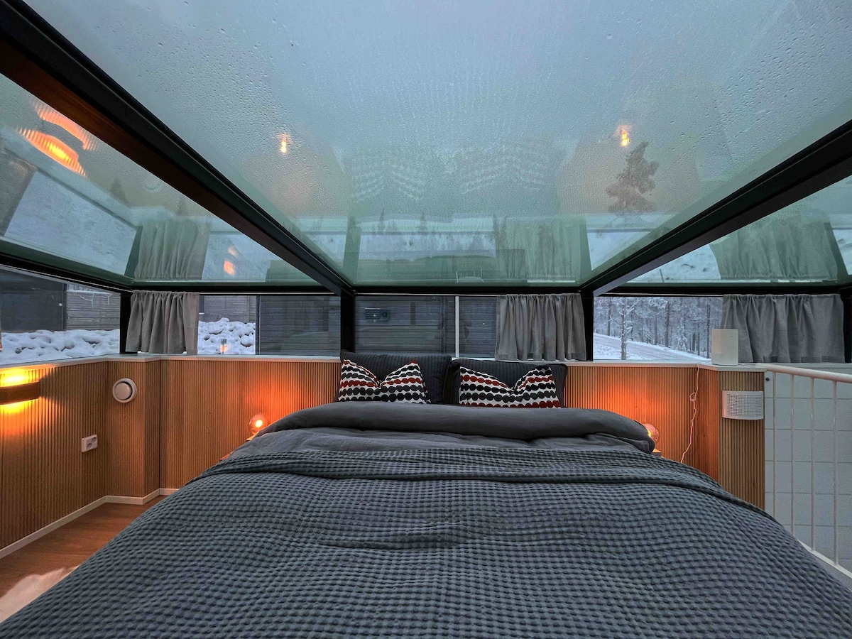 New glass igloo in Levi in the magical Utsuvaara landscape. The roof of the cabin is glass, so you can admire the northern lights and the northern starry sky from the parade ground.