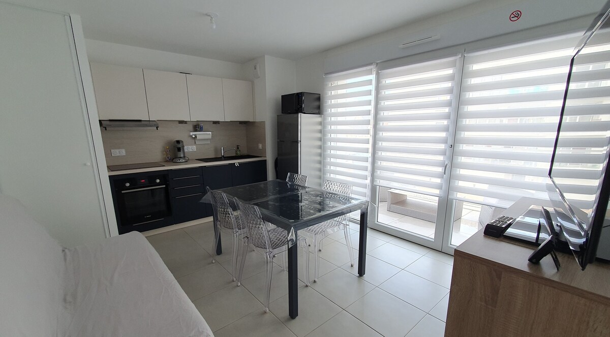 Beachfront: Charming studio 30m2 team and modern offering sea view On the 3rd floor without an elevator of a luxury building: entrance separate wc large shower room living room with storage 2 seater wardrobe comfortable sofa bz tv modern kitchen (dishwasher) and equipped. and of course a spacious sea view balcony with table and chairs to enjoy the view and the sun. easy and free parking The summer months (July August) the rental is per week Saturday to Saturday
