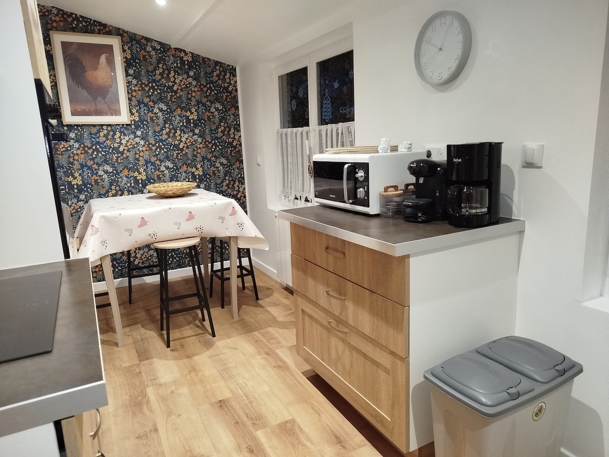 Charming single storey house with wood burning fireplace south facing west private and enclosed garden and terrace. This cute place, nestled in an outbuilding of the owners' house, is located on the edge of a quiet lane with a large park with trees, nature and meadows as neighbours. This place, not far from the Baie de Somme, the sea and the forest, will be ideal for a weekend, a holiday, or a telecommuting break for couples or families.