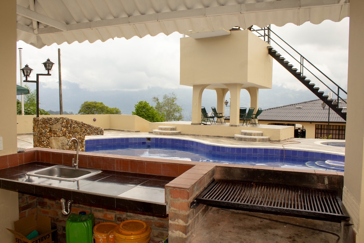 Lleva a toda la familia a esta fantástica finca, que cuenta con piscina, jacuzzi y área de bbq. La finca tiene 4 habitaciones, 4 baños, 3 terrazas, 2 salas, y cocina completa, con nevera, horno, airfryer, microondas, licuadora, batidora, picadora de verduras, sandwichera, etc. Cerca de la finca hay tiendas, venta de comida y comida rapida, cajeros automaticos y correponsal bancario Bancolombia. La finca está adaptada para personas con movilidad reducida.