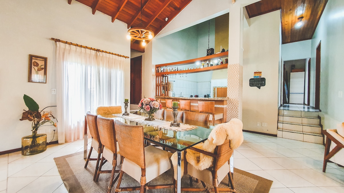 Casa 1944 is a farmhouse with lush nature waiting for your family. Located in Lomba Grande, in the rural area of Novo Hamburgo, the house is close to local shops, 15 minutes from the city and 50 minutes from Porto Alegre. We have a large house with 4 bedrooms, a combined living room and kitchen, a fireplace, two suites (one with a bathtub), a garage, a kiosk with a barbecue, a swimming pool, a soccer field, two ponds, and nature for you to connect and enjoy unique moments and create affective memories.
