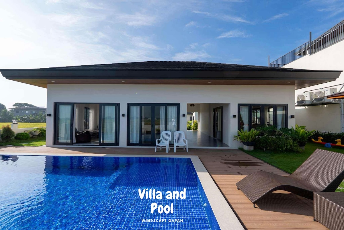 Welcome to Windscape Gapan, a private staycation retreat where nature meets luxury. Enjoy a serene garden view, breathtaking panoramic views of rice fields, a refreshing private pool and our 12 seater, Netflix Studio level home theatre.