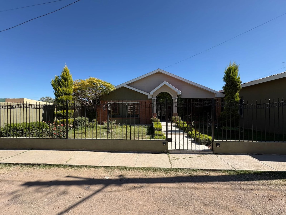Escápate a la tranquilidad de Casas Grandes Hospédate en una casa amplia, limpia y totalmente equipada, ideal para familias y grupos. Disfruta un ambiente rodeado de naturaleza, con asador, fogata, área de juegos para niños y estacionamiento gratuito. A solo minutos de Paquimé, temazcal, aguas termales, y a corta distancia de Mata Ortiz y la Cueva de la Olla. Un espacio cómodo, seguro y perfecto para descansar y crear experiencias.