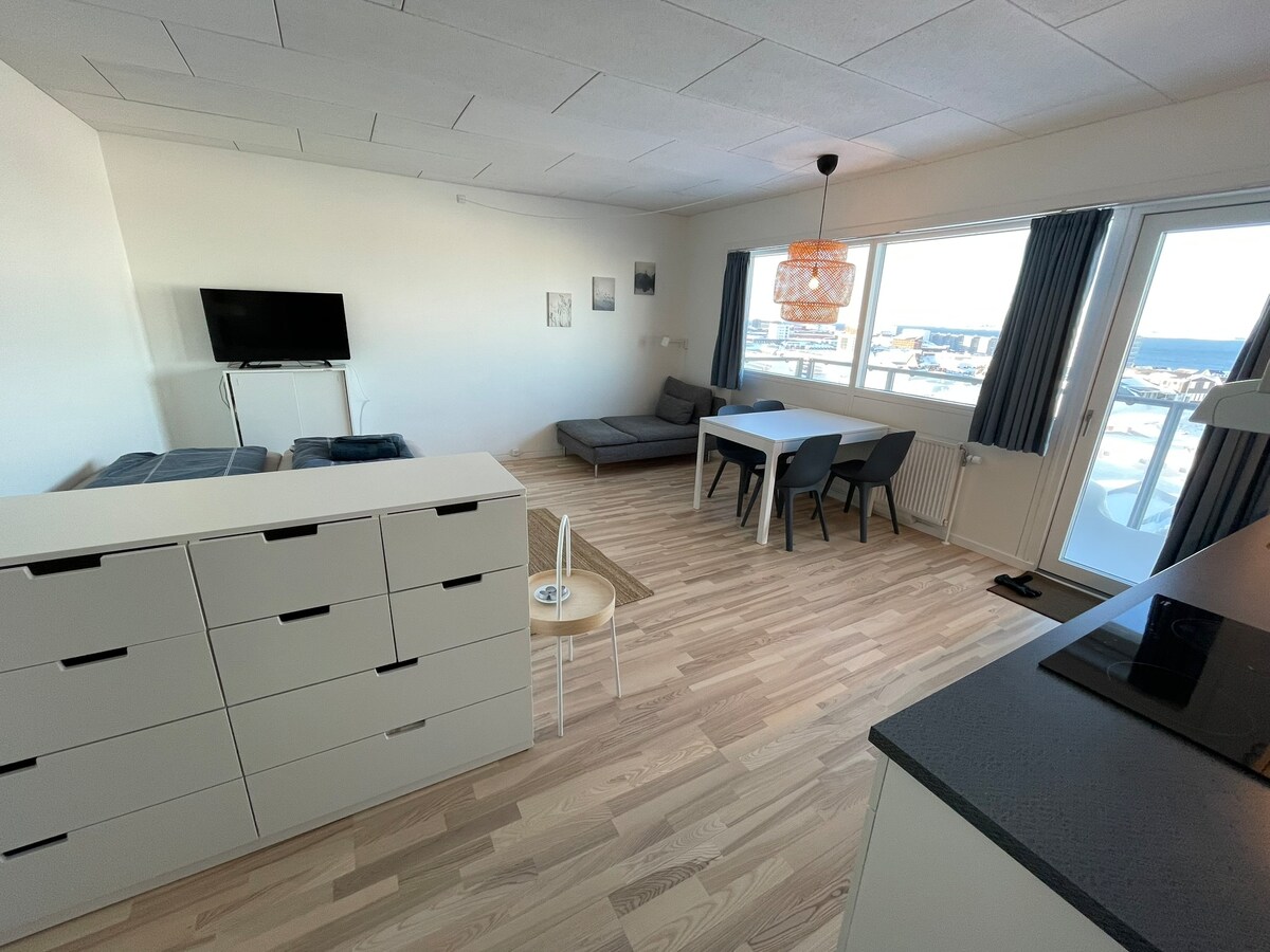 Nyd din ferie i en unik nybygget lejlighed, med den bedste udsigt over Nuuk fjorden. Nyd solnedgangen og se nordlyset inde fra lejligheden. Det er i et roligt og hyggeligt område i den gamle og ikoniske bydel “myggedalen” Det er i gåafstand til kolonihavnen og bymidten. Den rummelige lejlighed har en hyggelig stue med stort TV, samt fuldt udstyret køkken. Soveværelset har en dobbeltseng og i stuen er der en stor og behagelig sovesofa. Lejligheden deler indgang med et lille kontorfællesskab.