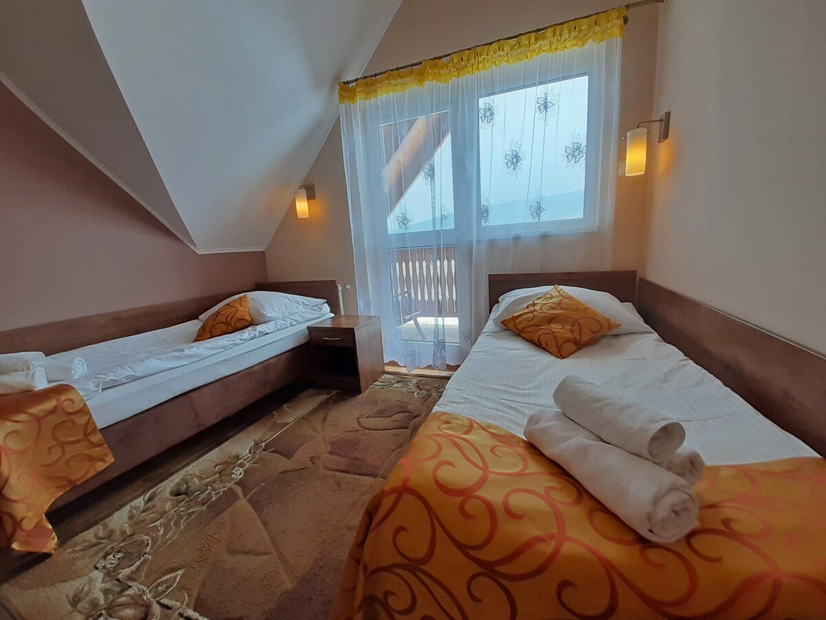 This is a room for two people located in the Zielone Wzgórze Guesthouse. The Zielone Wzgórze guest house is located in Bolesławów in the Stronie Śląskie commune. Bolesławów is a village in the Kłodzko district in the valley between the Śnieżnik Massif and the Bialskie Mountains. We recommend accommodation, delicious food and relaxation in the SPA. The property has a playground, a campfire area and a barbecue patio. There is a sports field near the guest house. Each room has its own bathroom.