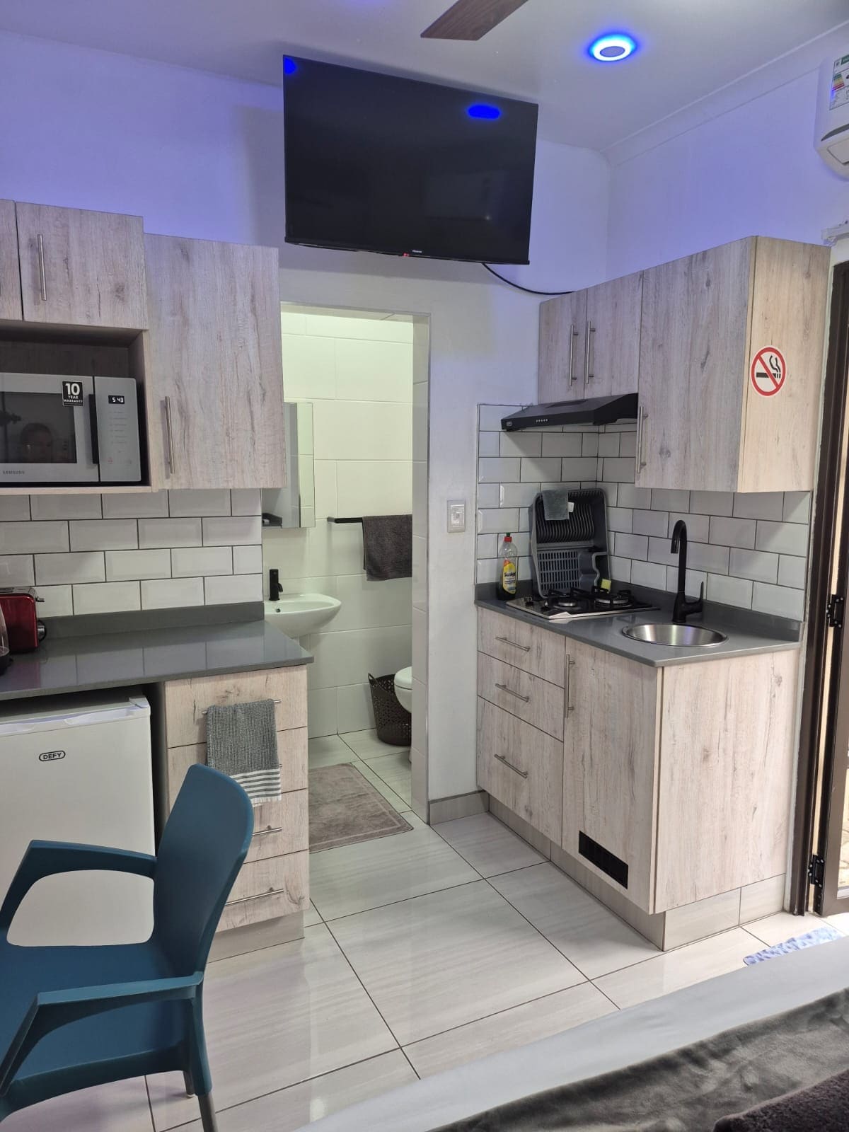 Pet freindly, private guesthouse in Richards Bay. A one-bedroom, self-catering unit with a queen-size bed and air con. En-suite bathroom with shower, toilet, basin, and walk-in closet incl small safe. Kitchen is fully equipped with a microwave, refrigerator, small stove, and two hot plates. In the living area, a double sleeper couch accommodates extra guests, and there’s free WiFi, Netflix, Prime Video, and YouTube for your entertainment. Private braai and lapa area with access to a pool