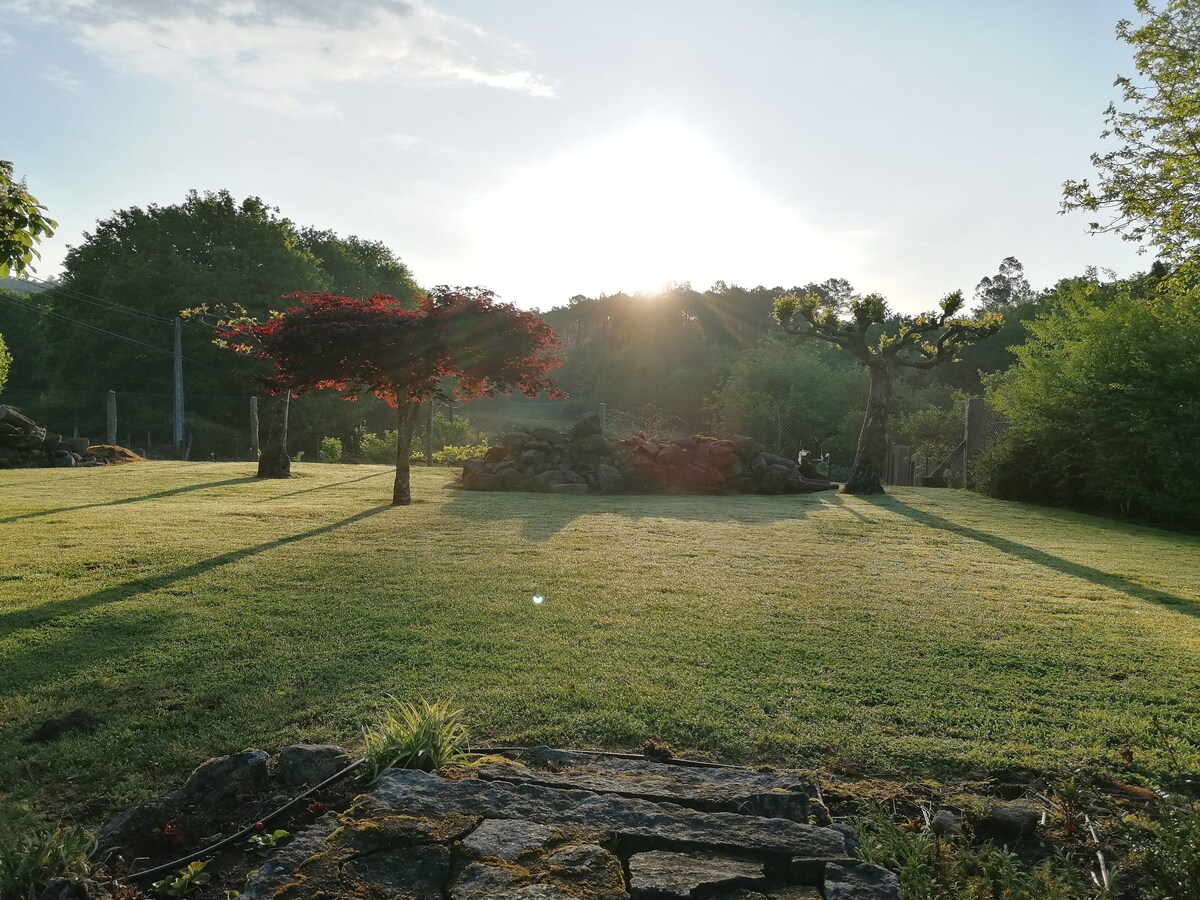 Lugar muy tranquilo para pasar unos días con tu pareja , familia , amigos .Casa y finca 1200 m independiente . Goian , pequeño pueblo ubicado en el Baixo Miño , fronterizo con Portugal (Camino de Santiago portugués ) . En un radio de 10 km se puede disfrutar de playas ( La Guardia , Camposancos , Caminha ) y de playas fluviales en un entorno natural espectacular. Bonitos pueblos de un lado al otro de la frontera , gran gastronomía y vinos , visita de bodegas . rutas de senderismo , bici etc.
