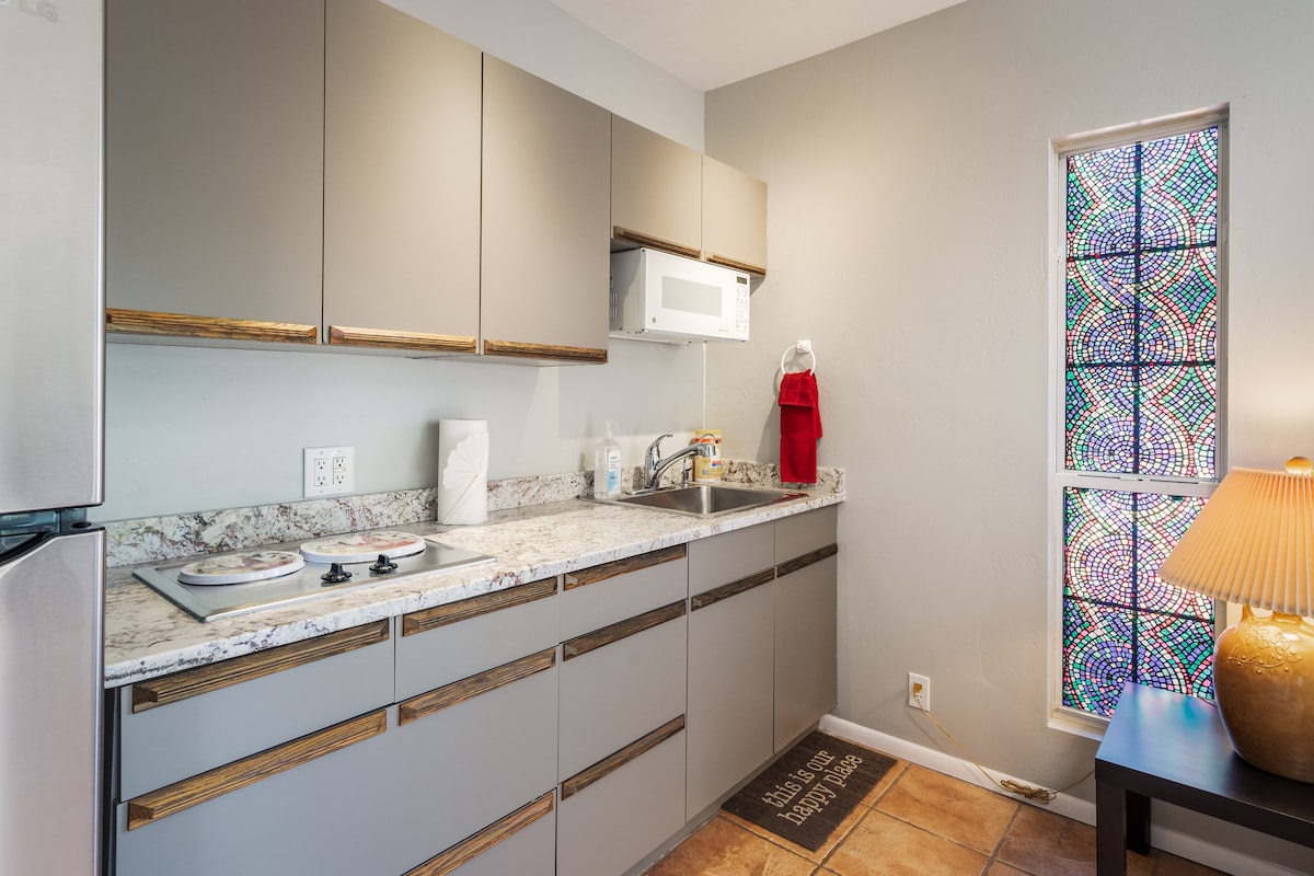 You will immediately feel at home in this one-of-a-kind casita, with its delightfully curated color palette and fabulous architectural design. Natural wood, stone, and metal materials are artfully woven together to create warmth and coziness, while the large windows and soaring ceiling create spaciousness. Prepare coffee or meals in the well-stocked kitchenette, and relax on the outdoor patio surrounded by mature trees. A short walk or drive to Whole Foods, restaurants & trails!