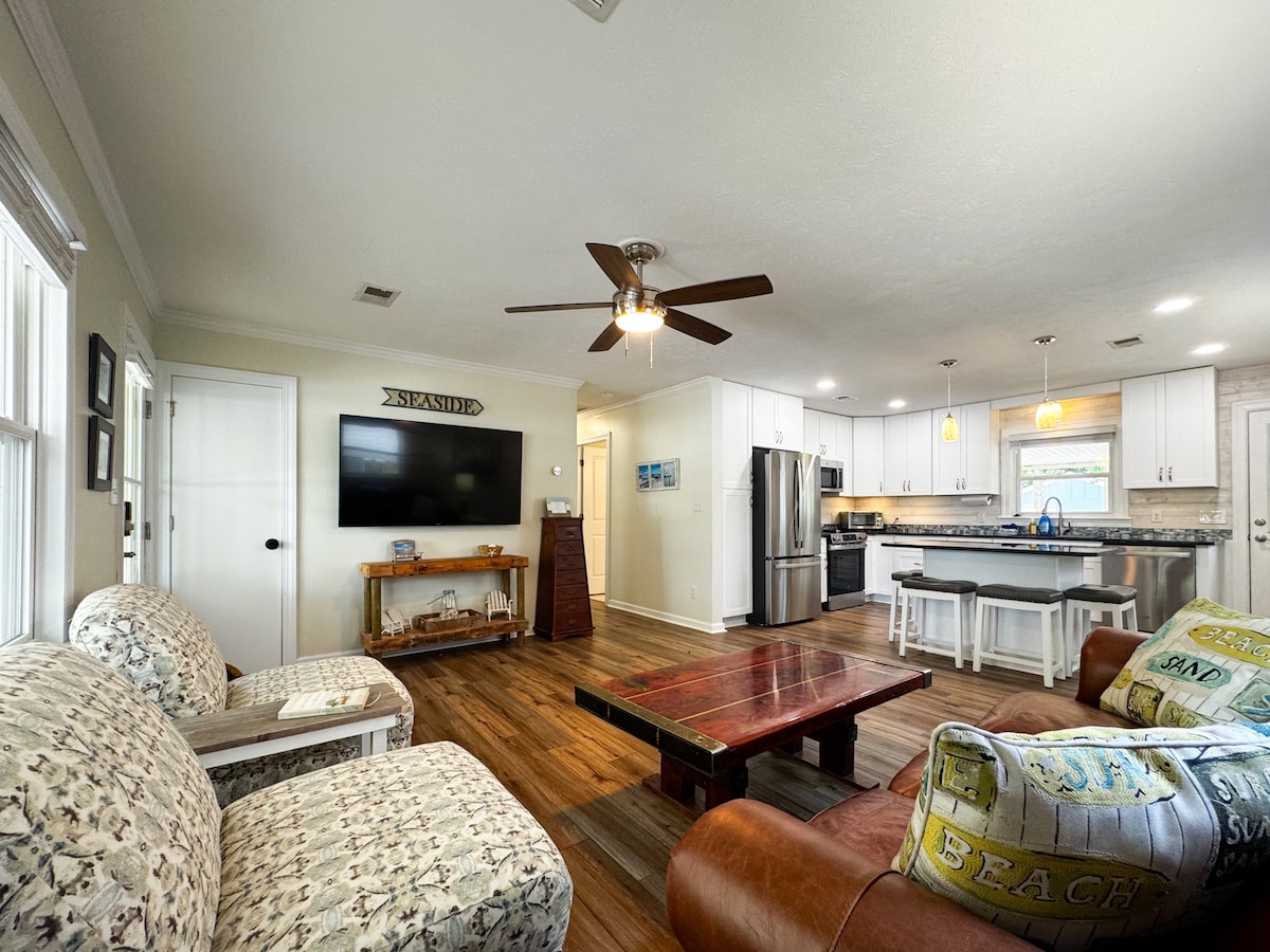 Welcome to our Coastal Oasis! Our space is 3 bedrooms (4 beds+ pack and play+ bassinet), 2 bathrooms, outdoor shower, extra large screened in front porch and back deck with dining area and grill. Our home caters perfectly to families (including those with infants and children) and everyone in between! Between lounging on the front porch (rocking chairs, egg chair, and couch set) or listening to music while grilling out back, we hope your time here is nothing but happy memories and fun times!