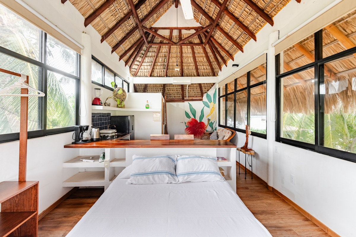 Cozy quiet cabin in a natural rustic atmosphere just a 2-minute walk from Zicatela beach. Surfing beach, ideal for sports walks and running in the mornings and afternoons, enjoy sunsets, bar area, shops and restaurants. There are two cabins in a natural rustic environment. Easy access by public transport to downtown Puerto Escondido, with banks, markets and bus station 5 minutes away.