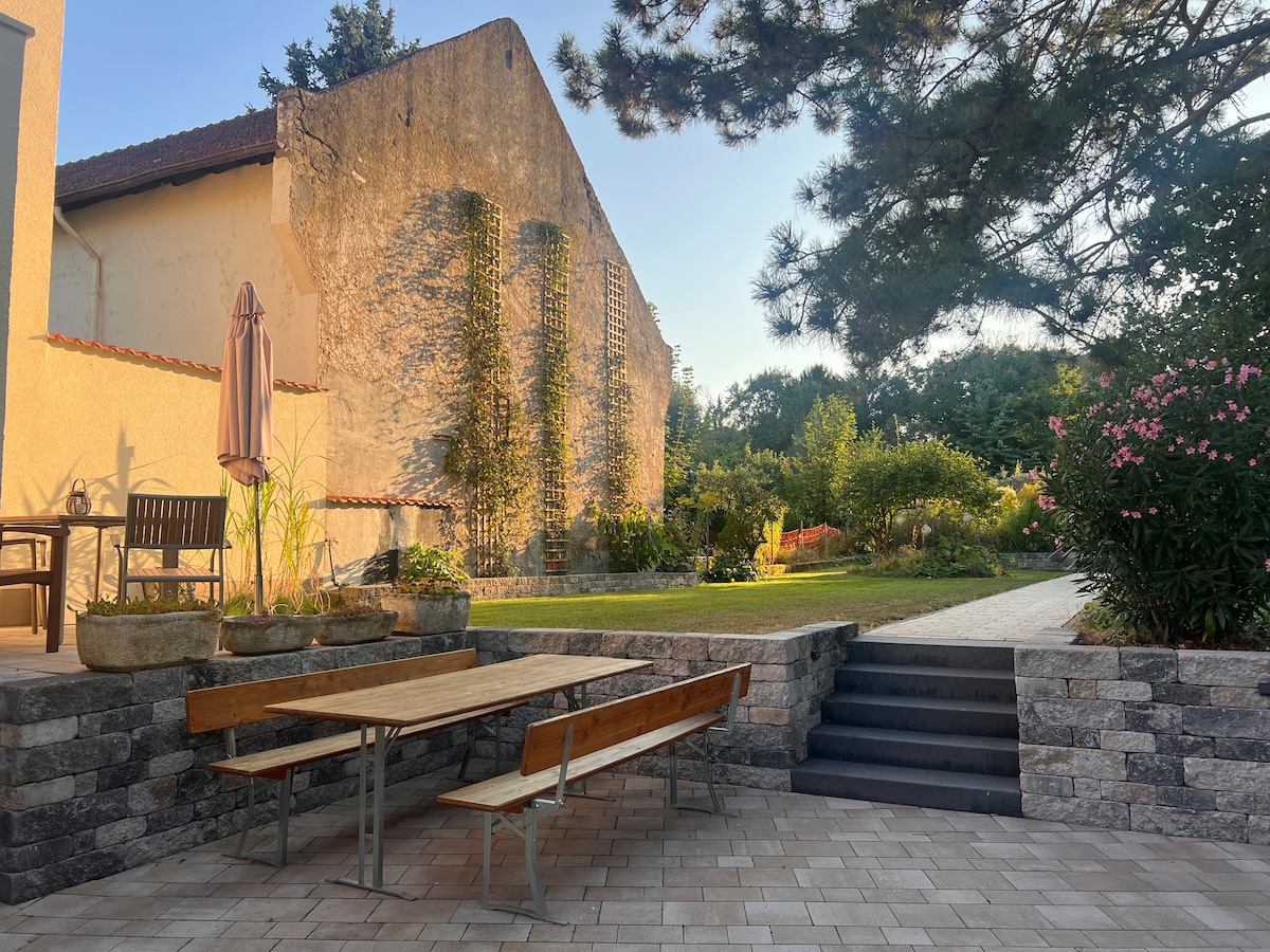 Fortunately, 15 levels! Our lovingly furnished bright apartment, approx. 40 sqm in size, has its own entrance and is located in the heart of Rheinhessen between Mainz and Alzey (15 min each). Equipped with a new kitchen one bedroom with cozy 1.60 double bed and a TV. A bright daylight bathroom with shower and toilet. Shower gel, towels, hairdryer, iron and ironing board are available free of charge.
