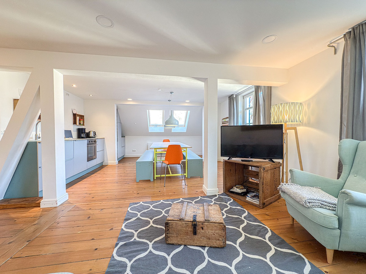 New 200 m² loft with fireplace for up to 10 people.