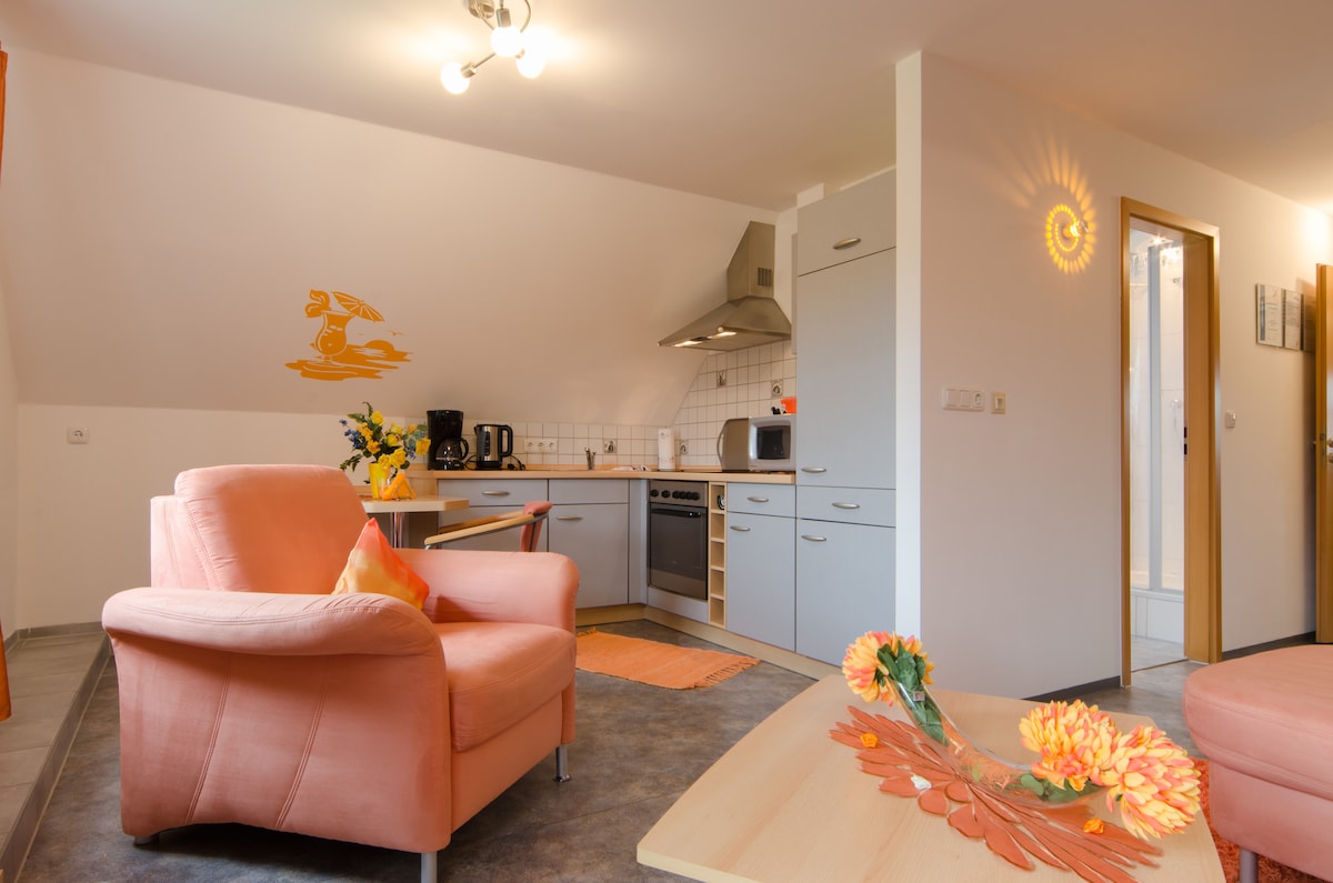 Kleine, offen gestaltete Ferienwohnung/ Einliegerwohnung im Erdgeschoß mit Einbauküche (Kaffeemaschine, Toaster, Wasserkocher, Kühlschrank mit Gefrierfach), Bad (Shampoo, Duschgel etc.) mit Dusche und WC, Handtücher, Bettwäsche, Föhn. Schlafzimmer mit Kleiderschrank, Wohnzimmer mit Schlafsofa, Esstisch, TV. Sagt uns gerne Bescheid wenn wir die Schlafcouch beziehen sollen. Familie mit Kinder sind herzlich willkommen, es ist ein Hochstuhl vorhanden sowie verschiedene Spielsachen.