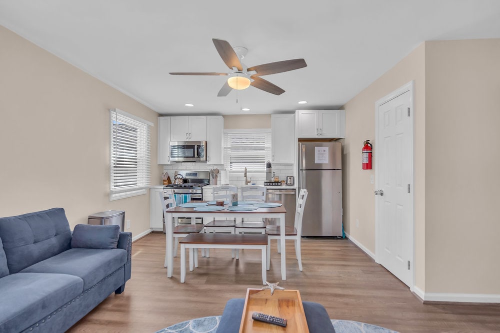 Unit #3 is a cozy, modern, and luxurious newly renovated downstairs apartment just 100 steps from the boardwalk and beach. Perfect for families and friends, it features all-new stainless-steel appliances, a fully equipped kitchen with dishwasher, washer and dryer, smart TV in living room and queen bedroom and USB/USB-C outlets. Free Wi-Fi, dedicated workspace, all linens and towels included, Beach essentials included: 4 beach badges, 4 beach towels, and 4 beach chairs.