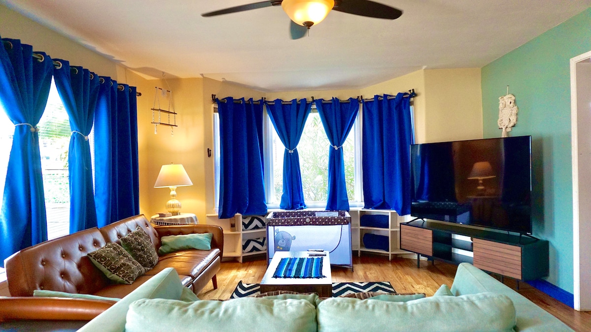 Dream vacation home! Less than mile to beautiful ocean. Clean, comfy, cozy home w/full kitchen, ambient lighting, ceiling fans, cable tv in living room & bedroom, & outdoor tournament size shuffleboard court. Beach chairs, umbrellas & boogie boards. Rent E-bikes or beach cruisers 7 blocks away. Perfect for private getaway & making memories. Private parking steps from front door. Speedy internet: 333mbps. To accommodate family members & guests with allergies, we cannot allow any animals inside.