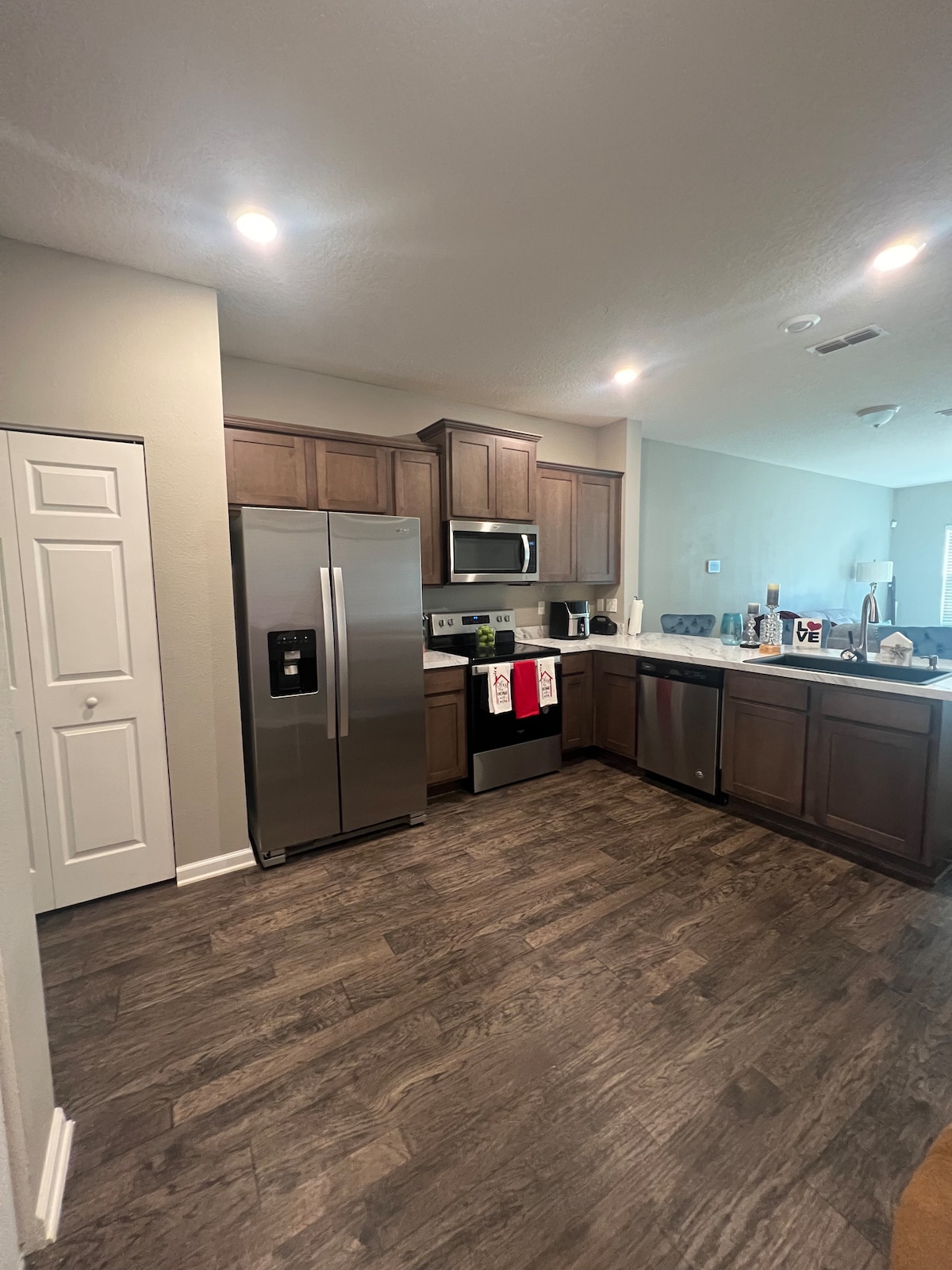 The house was built in 2023, with 4 bedrooms, 2 baths, full kitchen, living/dining room and laundry. There’s a 6 car parking lot + a 2 car garage. Trailers and RVs are welcome (driveway is 60ft long). The back of the house has a fully fenced backyard with a fire pit and grill. In total, 8 people could fit comfortably, though up to 9. If you're staying over the duration of 28 days and would like something added, please let me know. I'll do my best to accommodate all my guests!