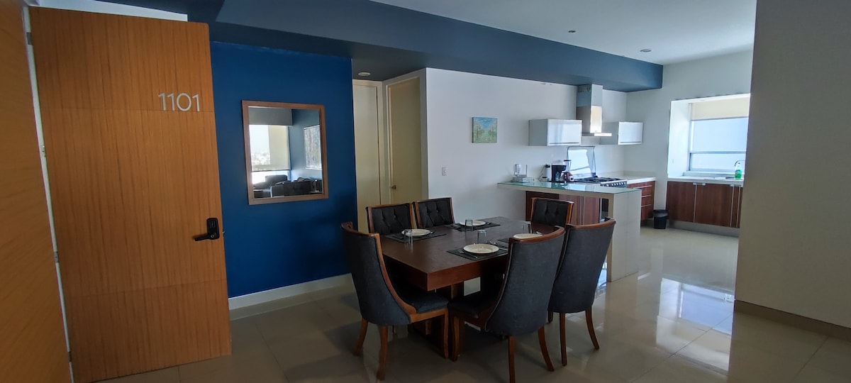 Located in one of Puebla's most emblematic residential areas, it has walking access to Sonata, a patio, gym, coworking, a game room, and an Olympic pool. Our rooms have been equipped with mattresses and sheets that will enhance your rest. Our living room has a 65" TV, a table for 6, and a kitchen equipped with everything you need to make your stay unforgettable. Parking is available with elevator access. We're waiting for you!