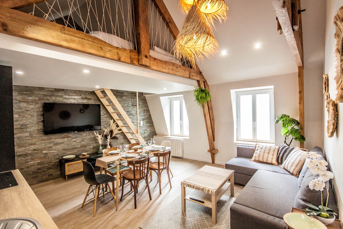 Welcome to L'Escale Cherbourgeoise! Bohemian atmosphere for this charming and cozy 40 m² apartment, ideally located in the hyper center. Completely renovated and newly equipped, it is perfect for 4 to 6 people. Close to the port, town hall and all shops. 15 min walk to the train station and the Cité de la Mer, 10 min to Naval Group and DCNS Street parking is free. Free port parking 200 m away. 24/7 check-in/checkout