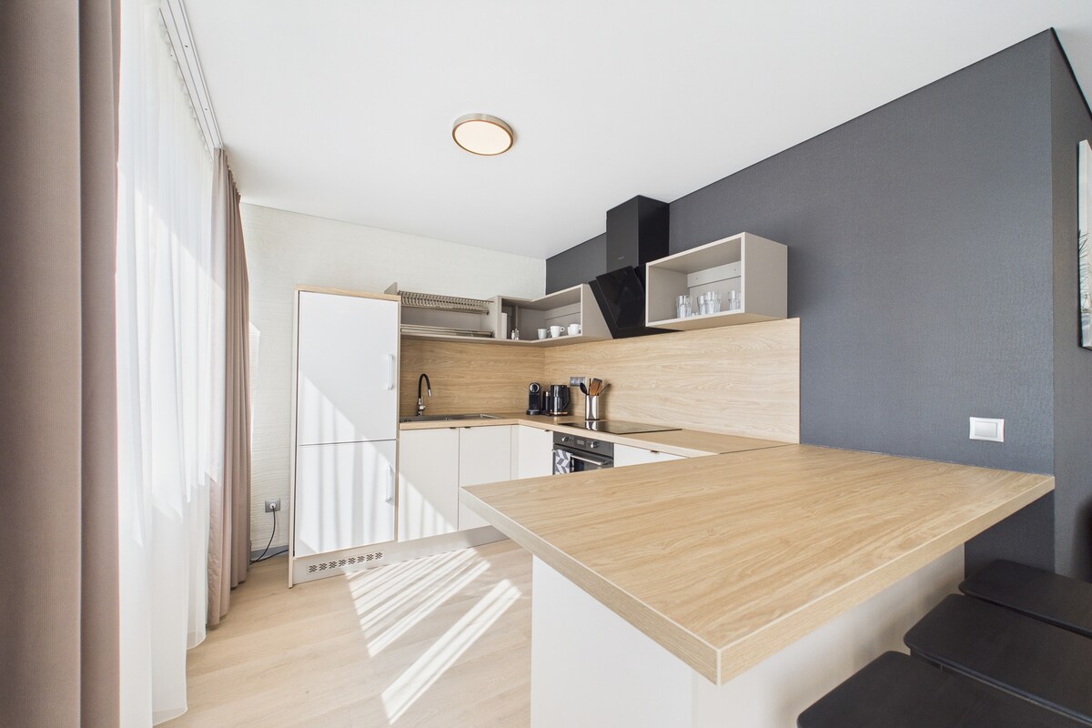 A fully equipped kitchen, two double beds, a bathroom, and a dining table. You will find a TV, free WIFI, air-conditioning, and a garderobe here. Included: • Bathrobes, towels, and slippers • Heated swimming pool (seasonal) • Private beach on the Daugava River • Grill zone (bring your charcoal and liquid) • Playground • Free Parking For extra payment: • Jacuzzi (50€)* apply at least one day before arrival • Sauna (50€) • Padel Tennis (20€) Please message us to add extras.