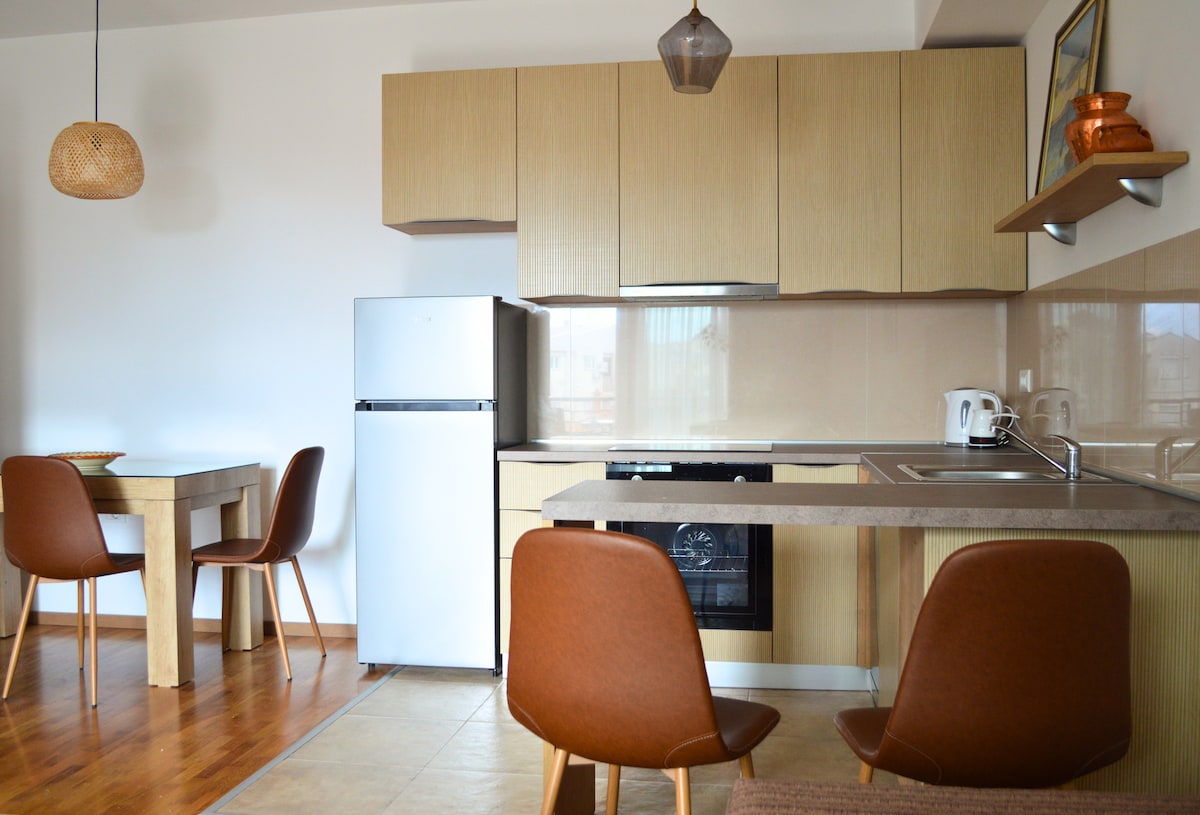 Cozy and modern apartment in Ohrid. This accommodation is ideal for a comfortable vacation, perfect for a family or group of friends, as it includes two bedrooms and one bathroom. The open-plan living area features stylish sofas, a smart TV, and a dining table for shared meals. The fully equipped modern kitchen ensures you have everything you need, while the apartment also offers free Wi-Fi, air conditioning, and a balcony with a peaceful view. It’s great for a relaxing family getaway.
