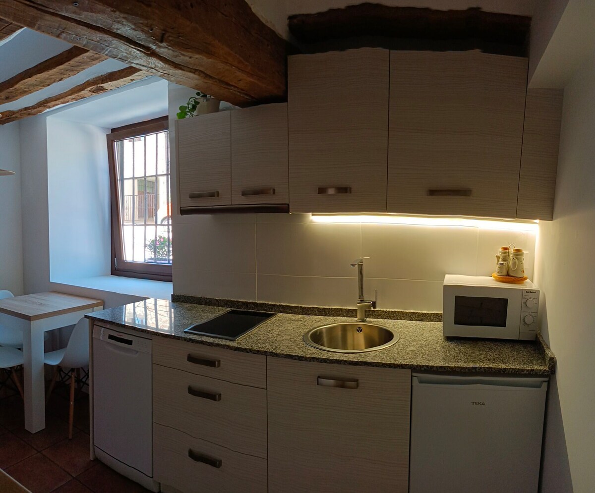 A 90 m2 ground floor apartment with an open day area and two spacious bedrooms. Newly renovated. Quiet, bright, comfortable and fully equipped. Ideal for couples and families with children. It overlooks a beautiful community garden. It also has a private parking space. The house is located in the heart of Ezcaray, a few meters from all the shops (pharmacy, bakery, banks, bazaar, butcher...) but away from the hustle and bustle, on a semi-pedestrian street.