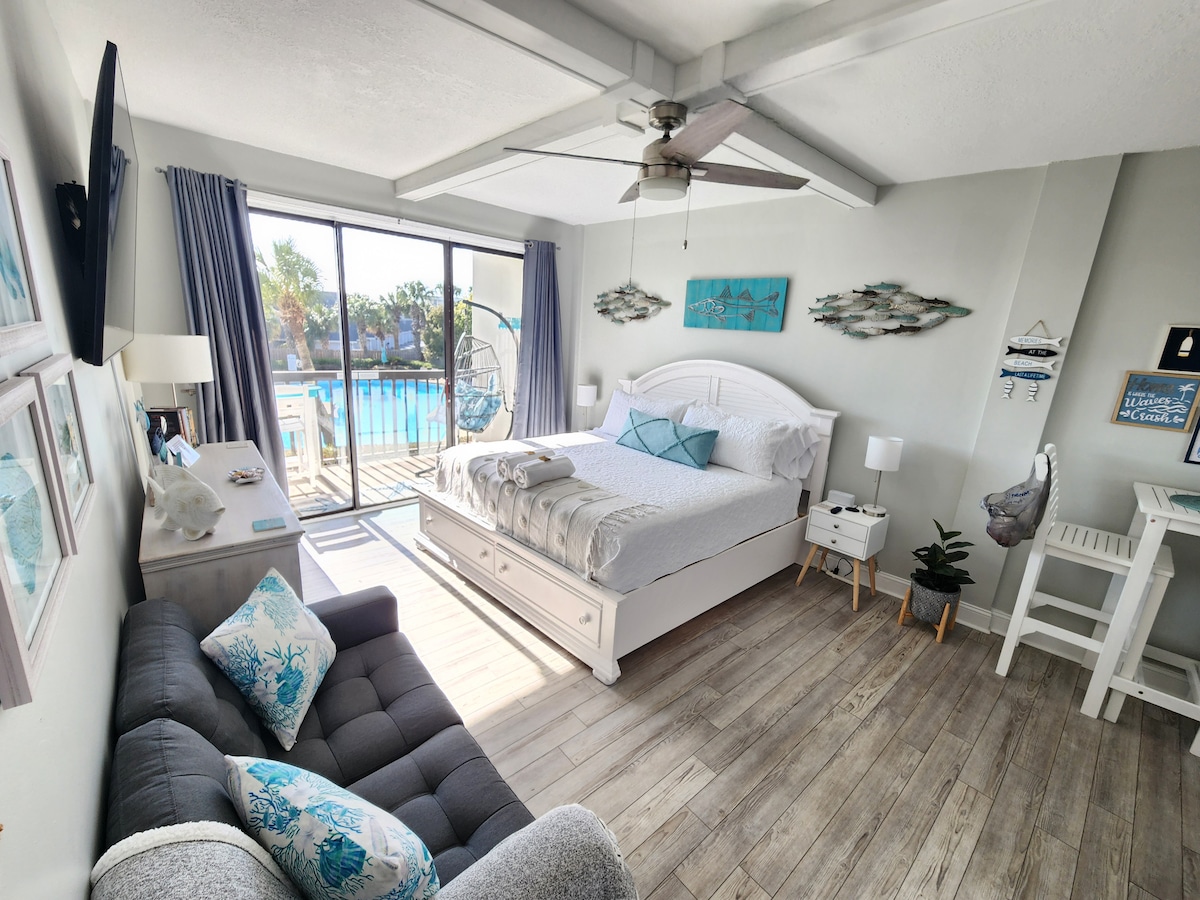 Welcome to The Salty Pirate, your waterfront vacation paradise! Kick back & relax in our calm, stylish condo featuring a king size bed, luxury bathroom & kitchenette. Relax in bed, enjoy the boats cruise by or watch the 65 inch TV. The waterfront balcony entices you to read & relax. Enjoy the resort style pool or reserve the 2-seater kayak (when available) provided for you to explore the waterway. Downtown restaurants & bars are walking distance & the white sugar sand beaches are 2 miles away!