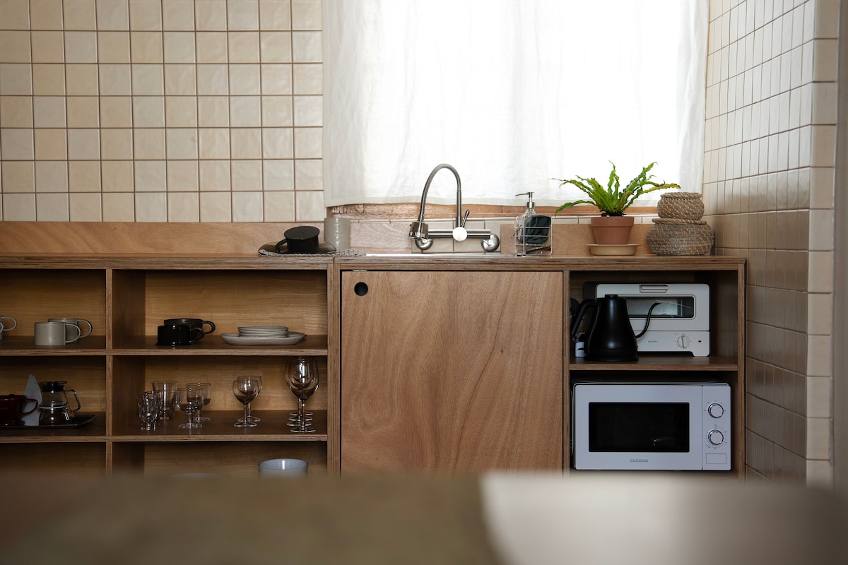 [Space with the interior of an old 80s building, Stay &] Located in the old town of Gunsan, this space is a living space created by gradually renovating an 1980s family home. We serve tableware made in the ceramics workshop on the first floor and tea and coffee from Gunsan brands. During your stay here, we hope you will take a moment to slow down from your daily routine and experience the leisurely pace of life in Gunsan.