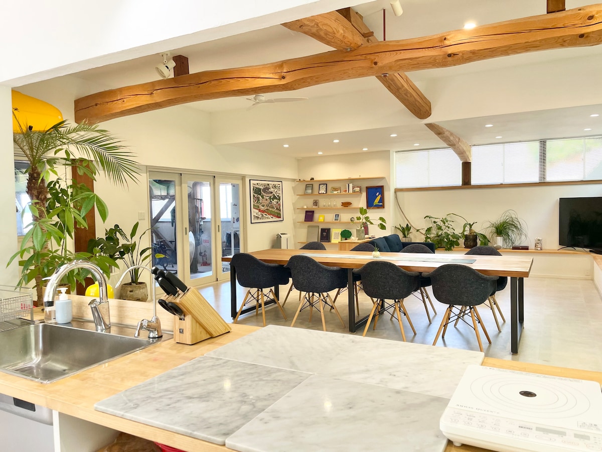 [National Park/Beachfront] Private Matsue villa for 1 group. 1F LDK for up to 8 guests. Oceanfront with waves as BGM. Direct beach access. "SEABASE villa at shimane" is a retreat in Daisen-Oki National Park. ■Highlights 1F LDK/Dirt Floor: Dining for 10. Open space. 2F Bedroom: Large windows with stunning ocean views. Amenities: Indoor garage, cookware, 65" TV, High-speed Wi-Fi. Activities: SUP, swimming, fishing, yoga, stargazing. Experience the "Luxury of doing nothing."