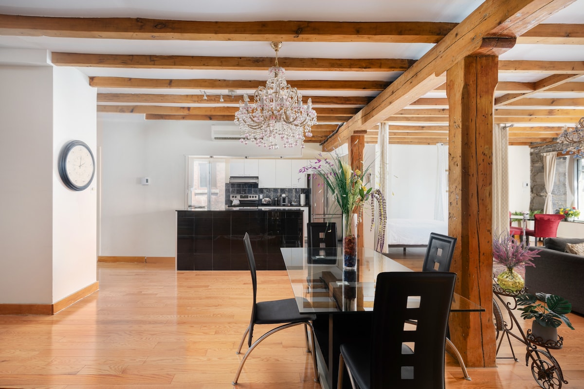 Experience Montreal's history in this stunning 1,900 sq. ft. Old Port loft. Originally a 19th-century fur factory, this unique space for families or groups features exposed brick, stone walls, and dramatic wooden beams. Explore iconic landmarks, restaurants, and the scenic riverfront, all just steps from your door in this incredibly walkable historic neighborhood.