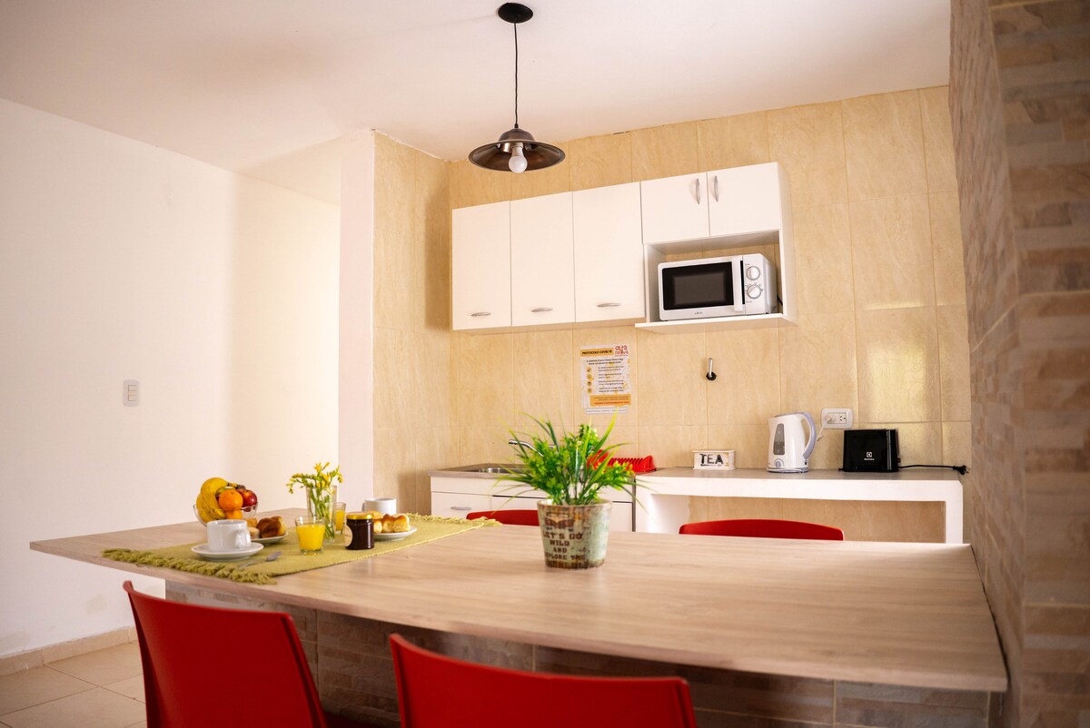 OLTA NATIVA has four (4) apartments with capacity for 2, 4 or 6 people, each has a bedroom, private bathroom, kitchen-dining room, living room and internal patio, green space (3 gardens). Equipped with single and double bed bases, air conditioning F/C, refrigerators, cable TV, kitchen, microwave, water heater, electric kettle, toasters and necessary dishes. Located 2 blocks from the main square. Breakfast included.