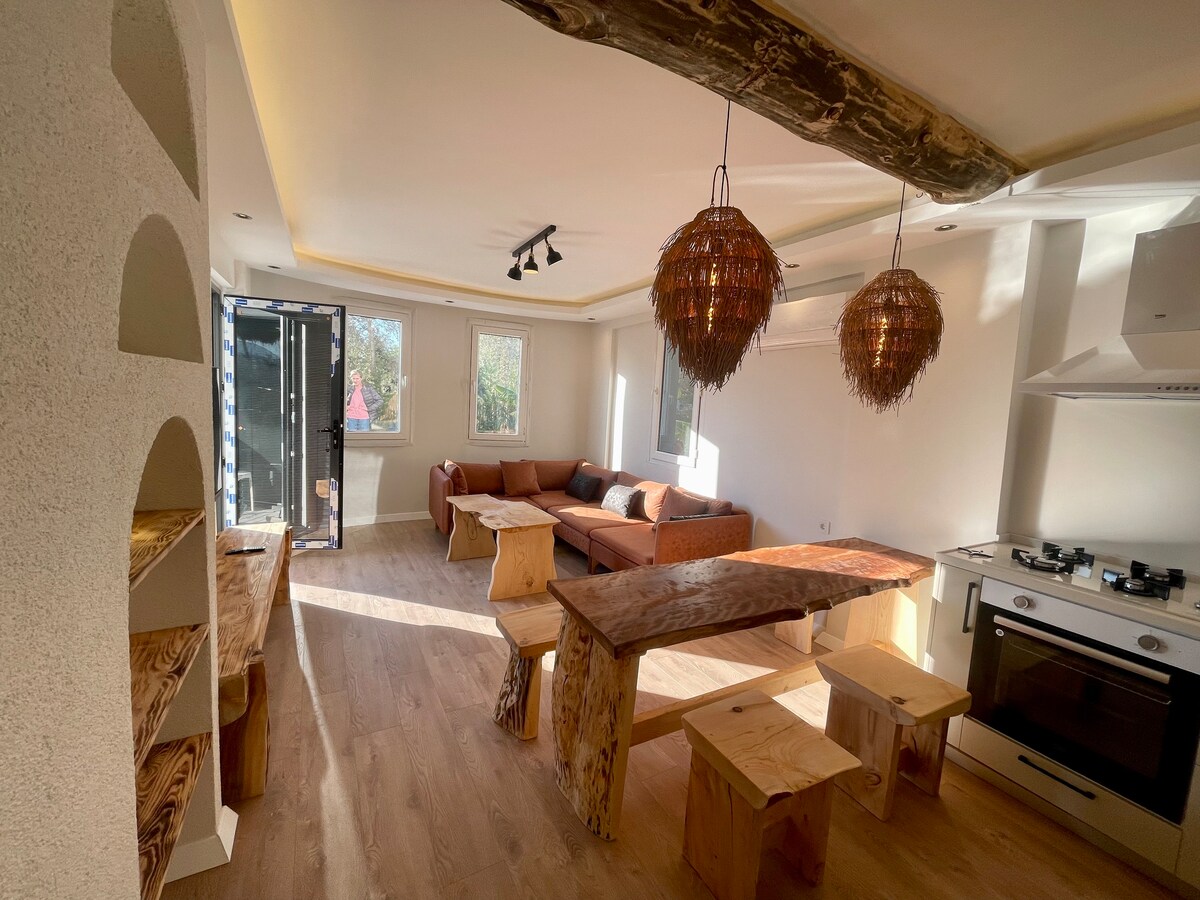 It is located in Fethiye, within a 5-minute walking distance to the beach, the region's largest beach park (with playgrounds, recreation and sports areas), supermarkets, cafes and restaurants. It has 24-hour hot water, unlimited and uninterrupted internet. The apartment has a pool view and the rooms are air-conditioned. All kitchen utensils and basic materials such as iron, hair dryer and towels are available. The TV is a large screen 126" Android smart TV.