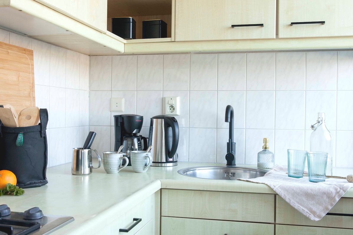 Beautiful apartment with 2 bedrooms. All to yourself. At the back, a spacious garden room with fireplace and next to it a private garden. You can heat the garden room with the fireplace. In winter, it may be too cold to sit there with just the fireplace. Bathroom has a 2-person bathtub and a double shower. The bathroom also has a washing machine and dryer. Wonderful apartment to stay completely on your own and enjoy the tranquility!