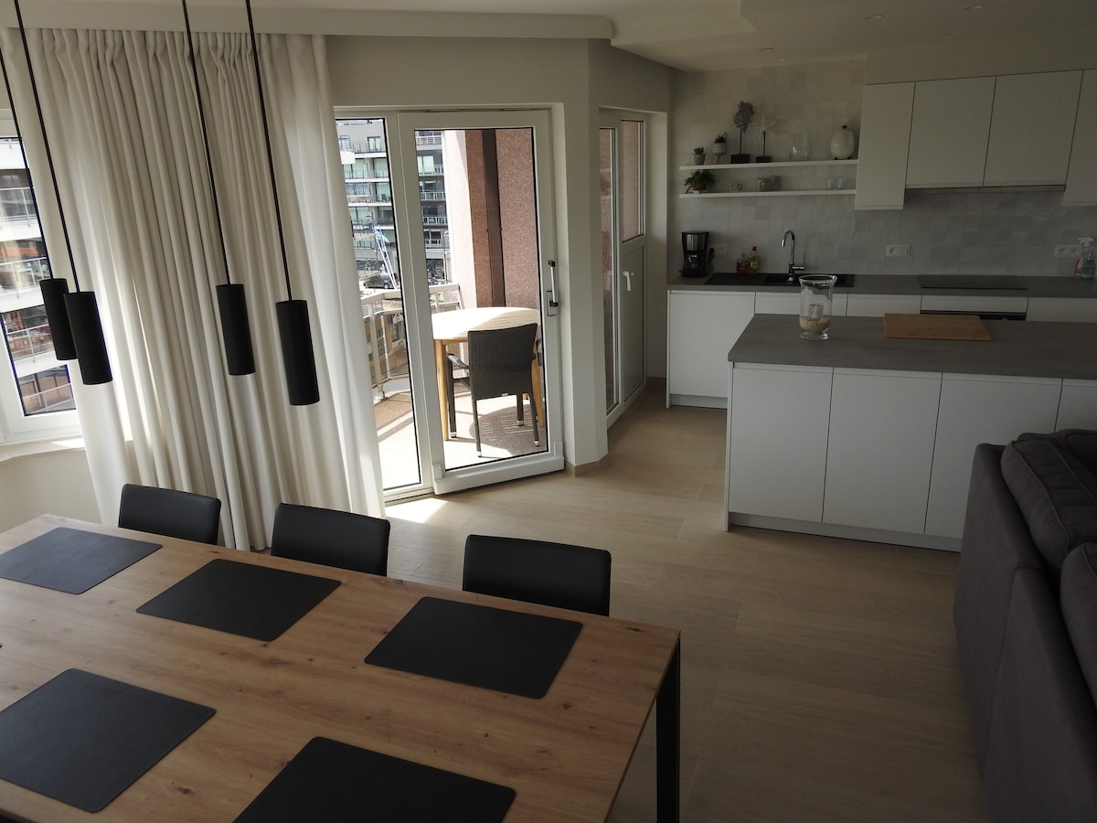 - Unique, spacious and luxurious penthouse for 6 people in Sint-Idesbald - Right by the sea, closest apartment to the sea - Beautiful location with the experience on the terrace as if you were sitting in the dunes. - Direct access to the beach and dunes - Furnished with great attention to detail and high-quality finish so you can enjoy all the comfort and relaxation - Free parking is available with 2 cars in the private garage boxes - Electric charging stations 500 meters away. - You can check in on your own upon arrival