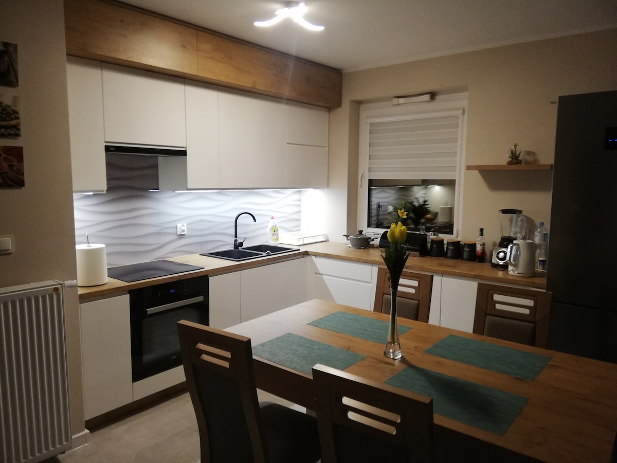 Spacious apartament (65 mkw) for a family or couple in a modern estate. ✔ Two bedrooms ✔ A fold-out double sofa in the living room (sleeping width 140 cm) ✔ Fully equipped kitchen - dishwasher, induction hob, oven, fridge, microwave ✔ TV, Internet Wi-Fi ✔ Towels and bed linen for guests ✔ The estate is monitored with external cameras and security ensures safety Playgrounds and mini gyms outside Free parking on the estate. Access to the gym.