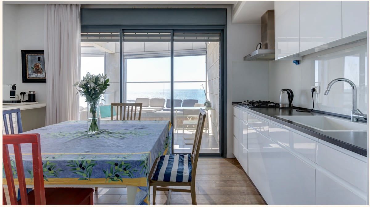 Private luxury apt with sea view at a beautifulll resort. Master bedroom & living room have large windows over ocean view, kids bedroom with two twin beds. The complex includes free swimming pools, jym, squash, tennis cour, lush well-kept gardening and playgrounds. 5 min drive from the old city & There are 2 big shelters in each level of the building. The apt is 15 meter from each of them.