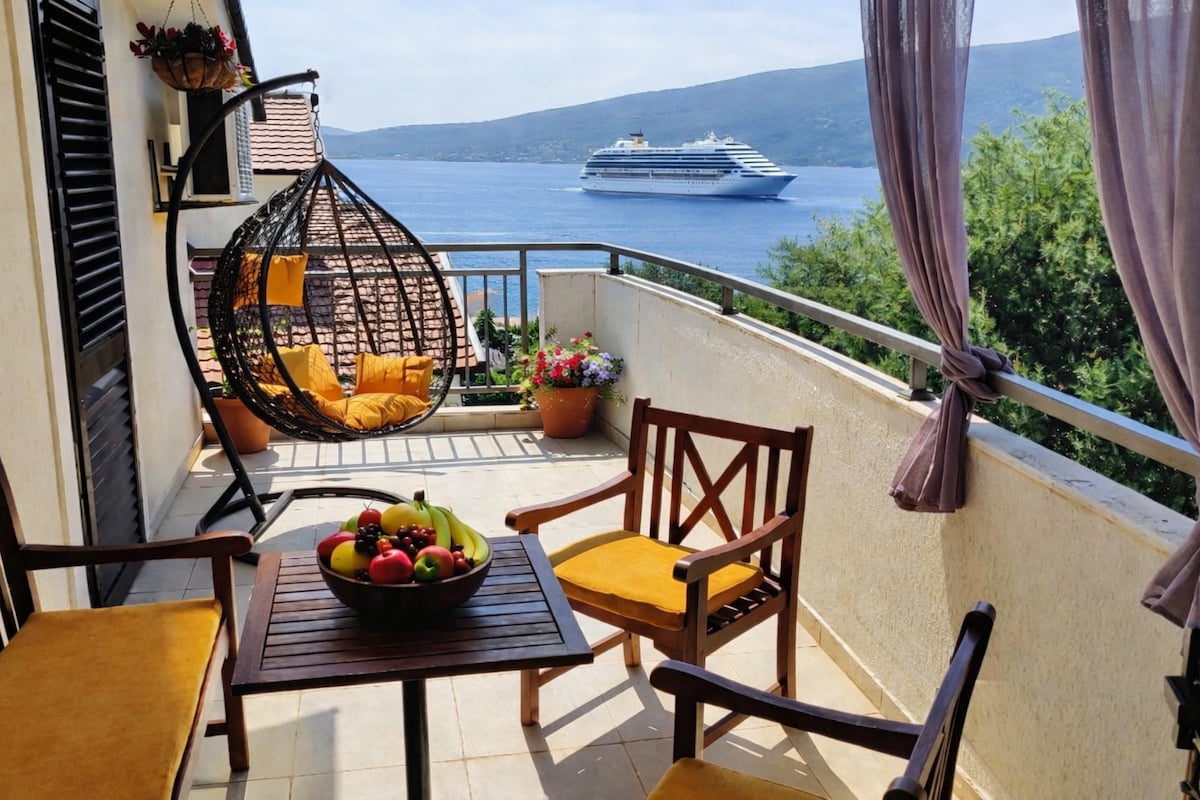 PERFECT FAMILY HOME! This spacious 50 m2 appartment is only 50 steps away from sea. You will love it for many reasons but especially for the stunning view. The appartment is in the sunniest part of Kotor Bay, a beautiful and ellegant zone, near the enchanting XVIII century Church Saint Eustahije. Position is pefect for exploring the jewels of Boka Bay - both Old town Kotor and Perast are only 5 km away. You will have your own portable WIFI to share your best moments wherever you are