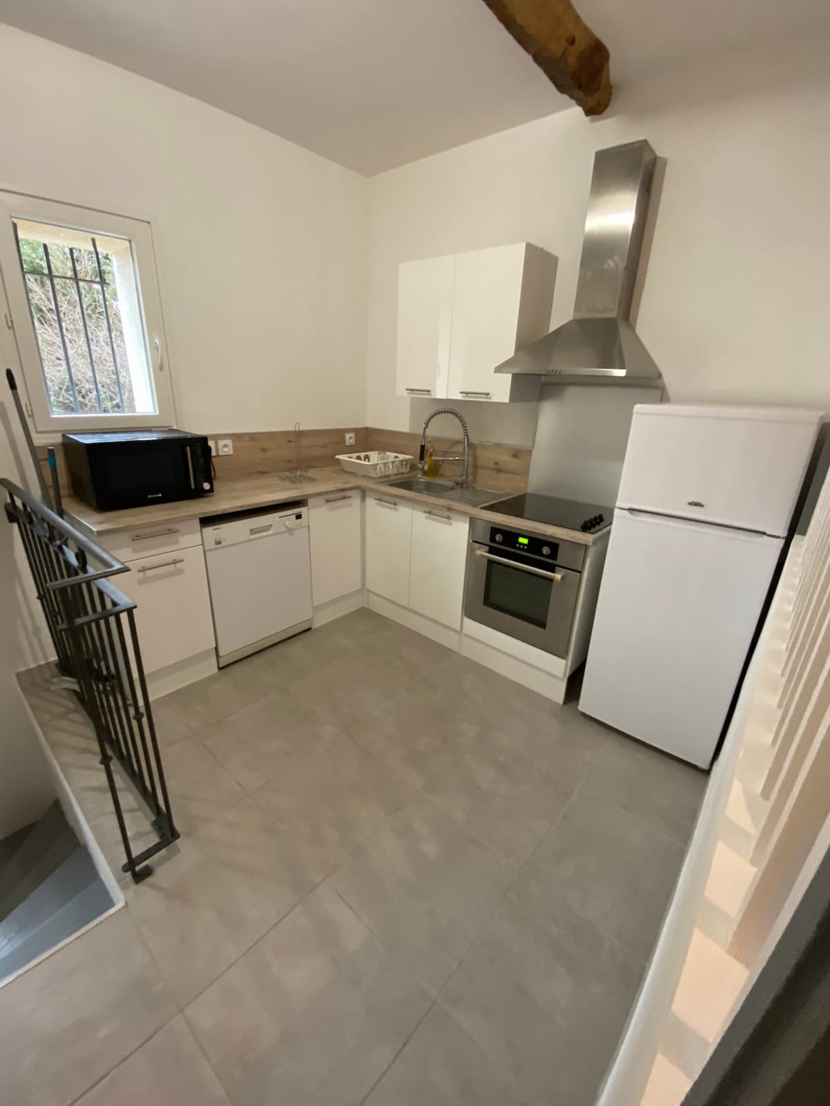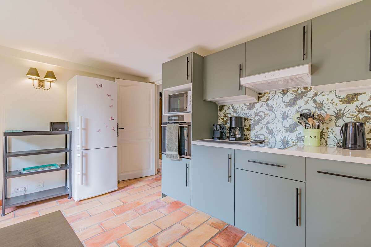 Independent studio of 25 square meters adjoining the Provencal farmhouse. Two large openings to the south overlook the shady courtyard near the pool. It has a bathroom with a walk-in shower. The kitchen is equipped with fridge, gas hob and microwave.
