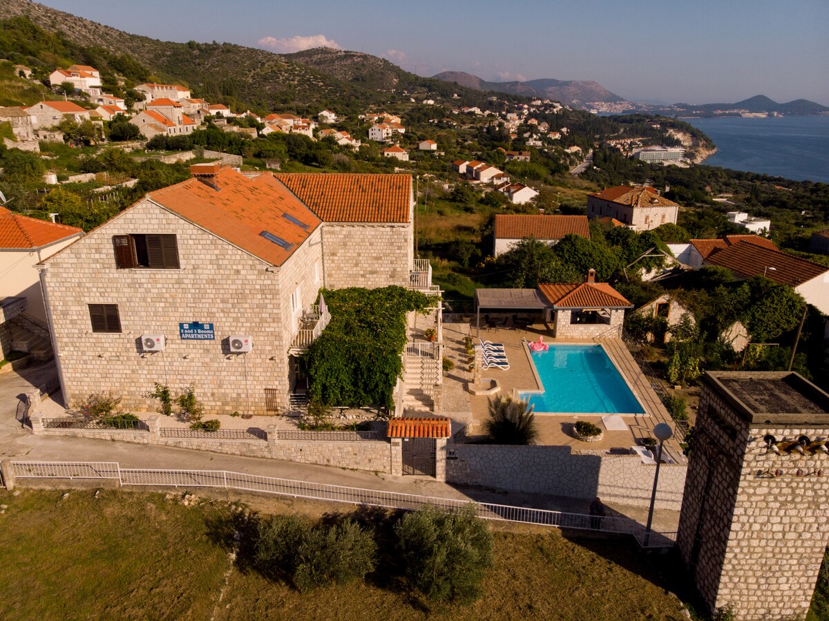 Our spacious apartment Valdinoce is in Orašac, a place 15 km away from Dubrovnik (20 minutes ride). It is situated at the first floor of our family house, with a nice sea view. This year we have expanded the terrace - it is 32 m2 to enjoy the view even more. Valdinoce features two bedrooms, one is double and one with two single beds, two bathrooms, living room and a parking place right next to it. Since apartment is at the first floor, there are a few steps to reach it. Welcome!!