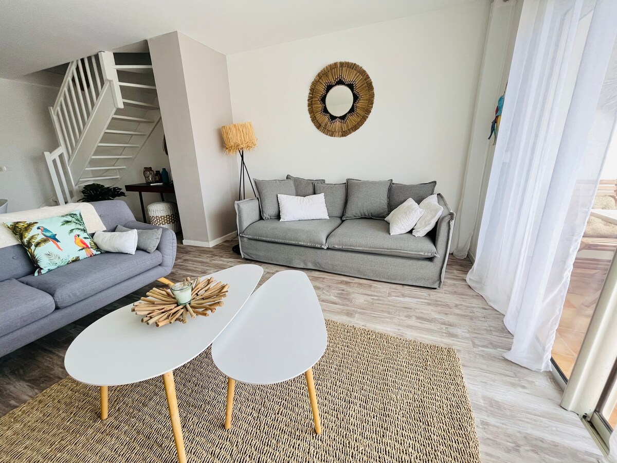 Refurbished duplex, located on the 1st floor of the ALAMANDA Residence, facing the sea. It consists of a private balcony, living room/kitchen, shower room on the first level and 2 bedrooms and a separate toilet upstairs. In the heart of Orient Bay, you have all the shops nearby as well as all the beach restaurants and water activities.