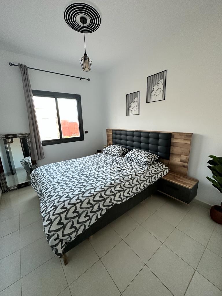 Beautiful luxury apartment ideal for couples or small families, located just 5 minutes from the beach and close to Marjane and all amenities. This luxurious apartment is located in a 24-hour secure residence with two accessible swimming pools, one for adults and one for children, as well as a green space and free parking. Spacious room, very comfortable sofa, very well equipped kitchen, a beautiful terrace. Air conditioning in all rooms.
