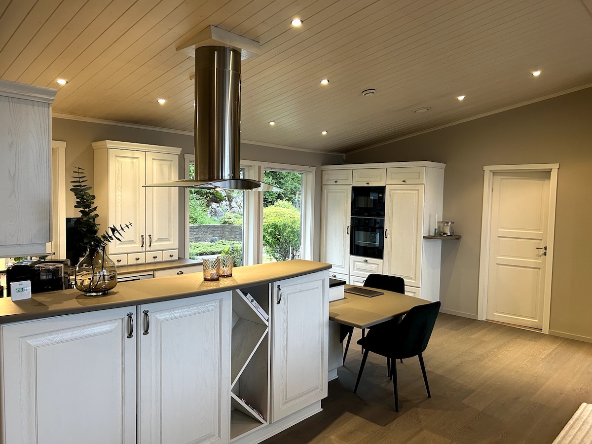 Pause fra hverdagen? Opplev vakre solnedganger og vær på nært hold! Hytta ligger i enden av en blindvei, usjenert beliggenhet med panorama utsikt. Moderne design. Kun deg og naturen. Et fantastisk utgangspunkt for fiske, kajakk, SUP og strandliv. Et rikt dyreliv, se havørnen som kan sveve sakte forbi. Stor hage med gressplen, store terrasser. Sol hele dagen. Benker og bord til å samle alle til et felles måltid. Pizzaovn til å lage Italienske godsaker. Oppskrift deler vi gjerne med deg!:-)