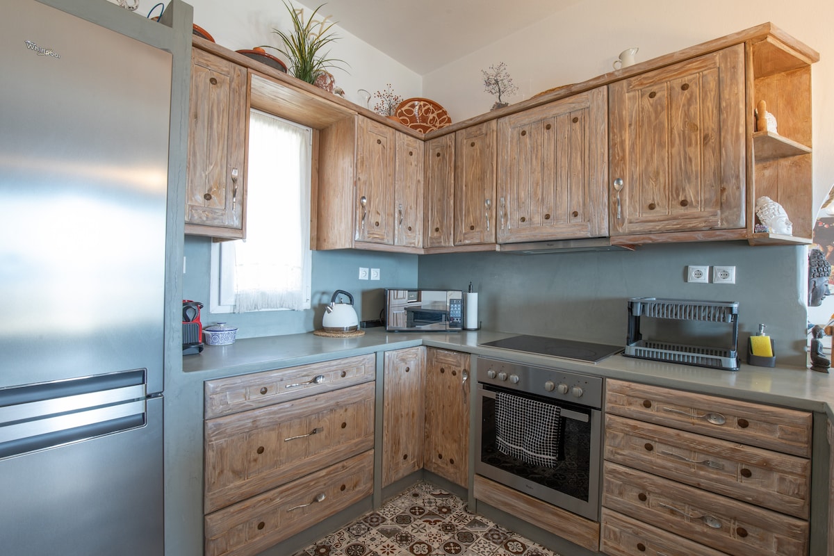 Sea view in a beautiful Mykonian Residential COMPLEX. GREAT LOCATION My place is close to the beach, nightlife, public transport, pharmacy, super market, bakeries and the airport. Ideal for couples, solo adventurers, and business travelers. Swimming pool Friendly environment. Accommodates 4 people. Location in a quiet area. 2 klm from Mykonos Center. 7 min walk from beautiful Ornos beach. 4 mins walk from Bus Station. a variety of shops and restaurants. WI-FI. & NETFLIX.